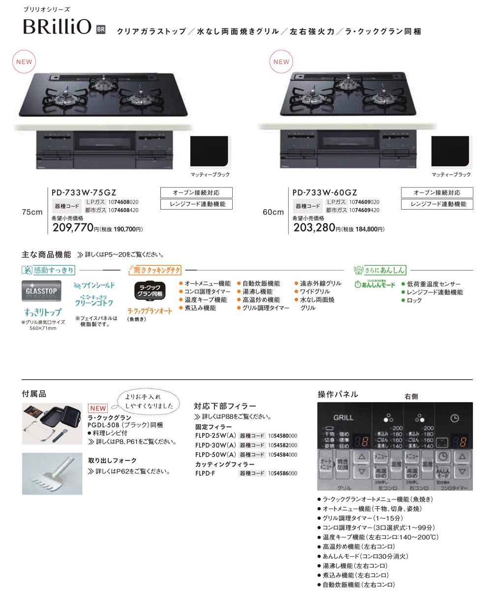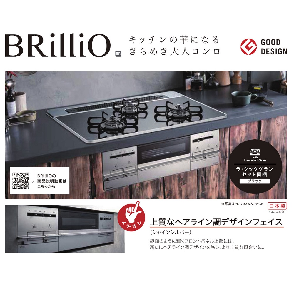 【パロマ】ビルトインコンロ -BRilliO ブリリオ Black Line- [W750・マッティーブラック]PD-733W-75GZ